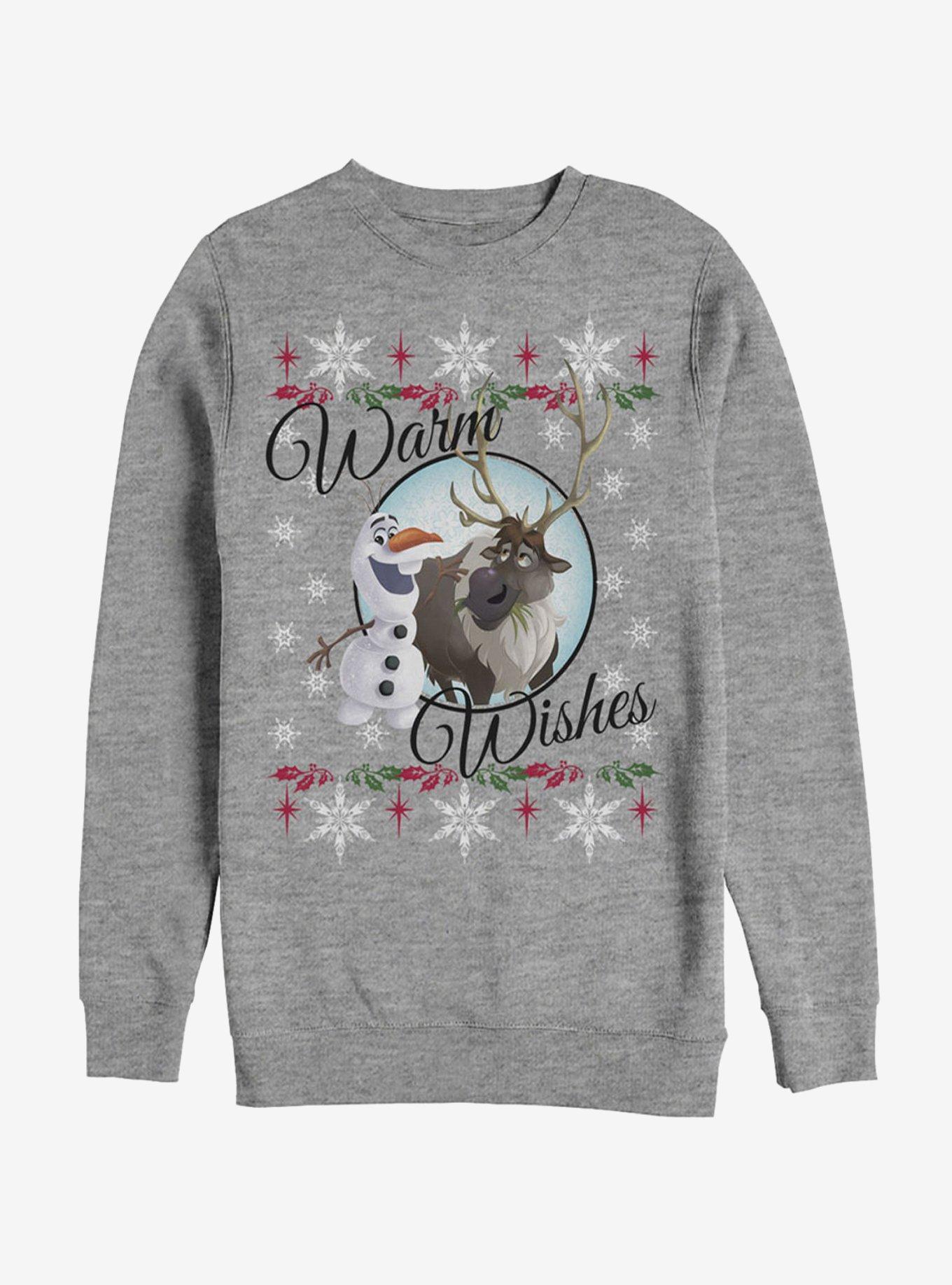 Never let it go, never let the Disney Frozen Christmas Warm Wishes Heather Gray Oversized Sweatshirt gooooo! Sven and Olaf smile out at you from this cute boyfriend-cut gray Christmas sweatshirt that reads "Warm Wishes" alongside snowflakes and holly! 50% Cotton, 50% Polyester.