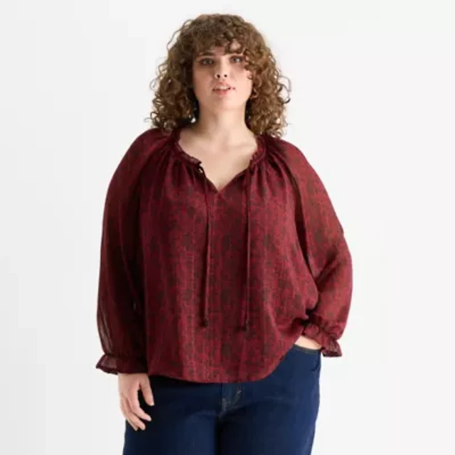 Worthington Womens Plus Split Tie Neck Long Sleeve Blouse
