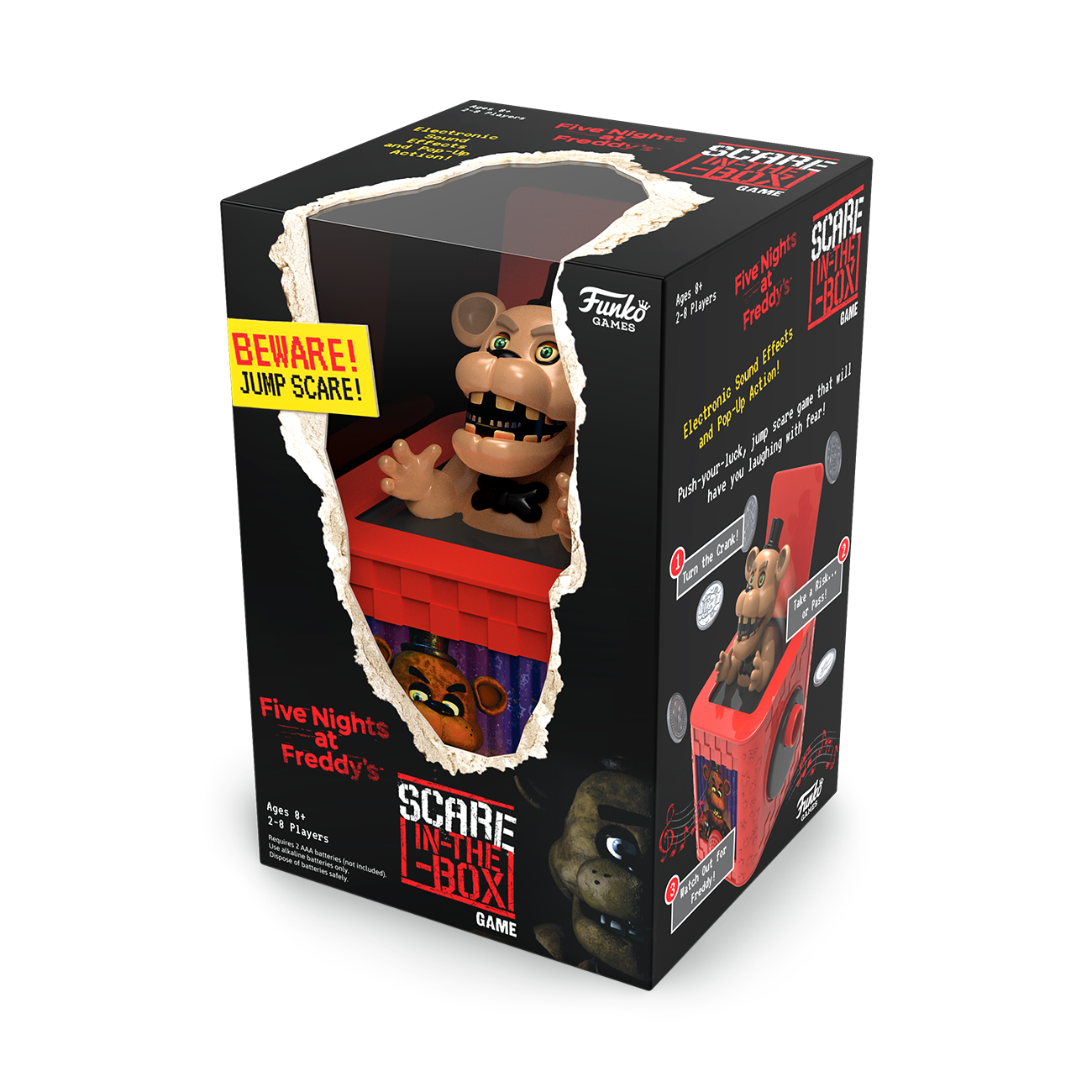 Beware the scare! Push your luck and try to survive in this exciting game inspired by the smash-hit series. Turn the crank as far you dare... but if Freddy pops out, you’re captured! Whether you pass the box or take a risk, Scare-in-the-Box will have you laughing with fear!