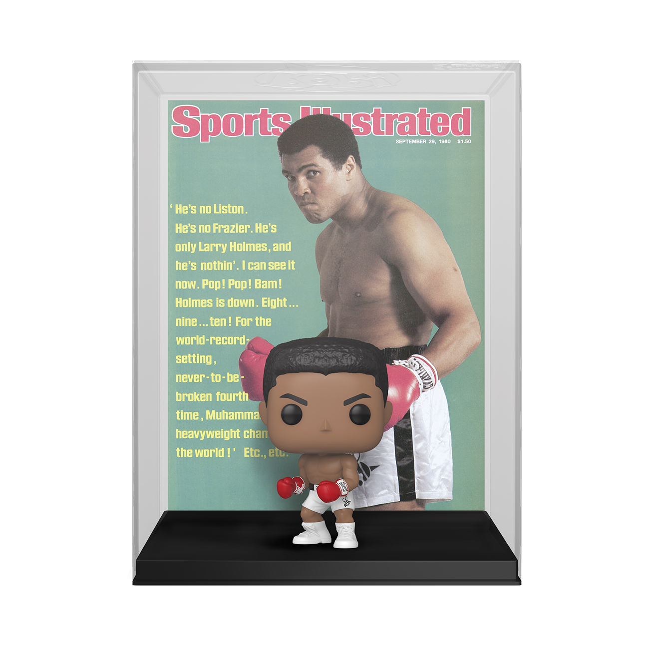 Celebrate the Greatest in boxing history by welcoming POP! Muhammad Ali to your collection as this POP! Magazine Cover! This collectible features POP! Muhammad Ali against a backdrop of himself on the cover of Sports Illustrated Magazine. Vinyl figure is approximately 4.05-inches tall. Pop! figure is adhered to backdrop to ensure display integrity. Approximate dimensions of protective case: 8.75” W x 11.5” H x 3” D.