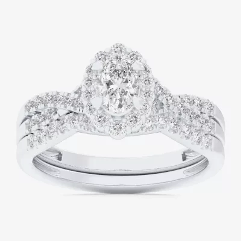 (G-H / Si1-Si2) Womens 7/8 CT. T.W. Lab Grown White Diamond 10K Gold Oval Side Stone Halo Bridal Set