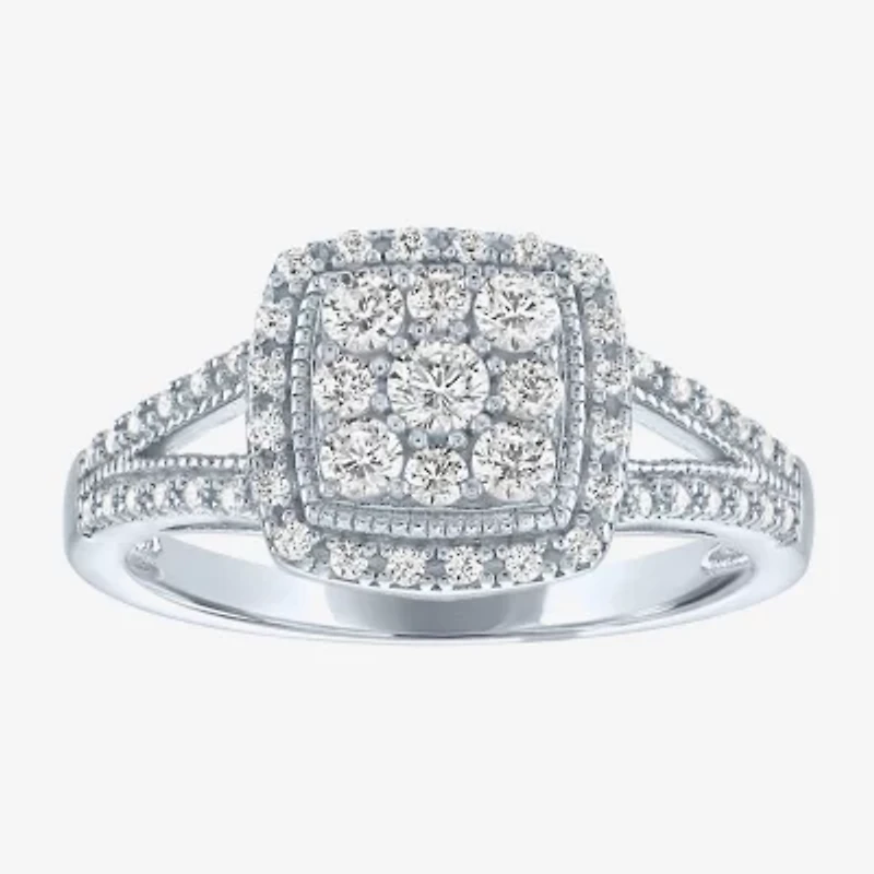 Dress up any look with this women's Sterling Silver cocktail ring featuring a cluster of round-cut Lab-Grown Diamonds arranged in a cushion shape and surrounded by a halo of additional stones. The split shank is also encrusted with additional Lab-Grown Diamonds bringing it to a half a carat total weight.