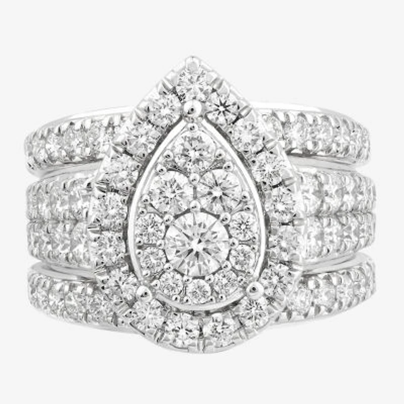 (G-H / Si2) Womens 3 CT. T.W. Lab Grown White Diamond 10K White Gold Pear Side Stone Halo Bridal Set