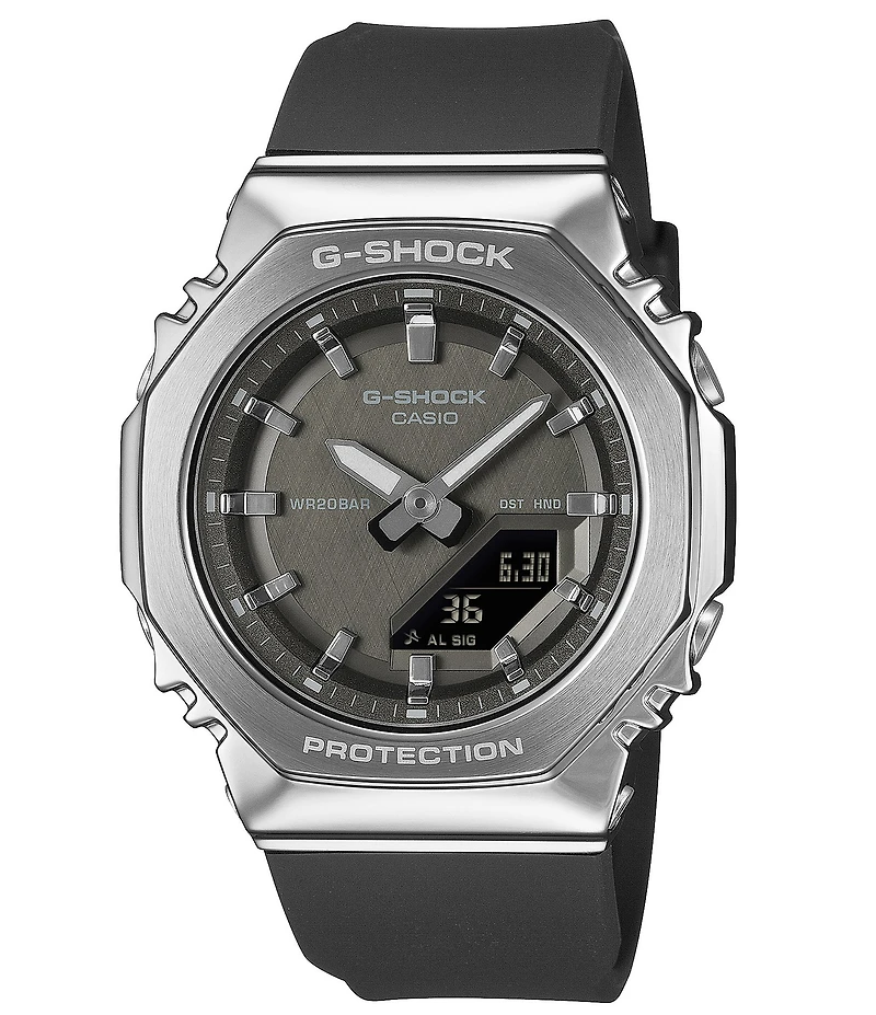 From G-Shock, this watch features: Metal case Approx. 45.9 x 40.5 x 11mm case size Analog/digital movement 3 year battery Multi alarm Stopwatch Timer Full auto calendar World time Hand shift feature Bio based resin strap Buckle closure Water resistant up to 200M Imported.