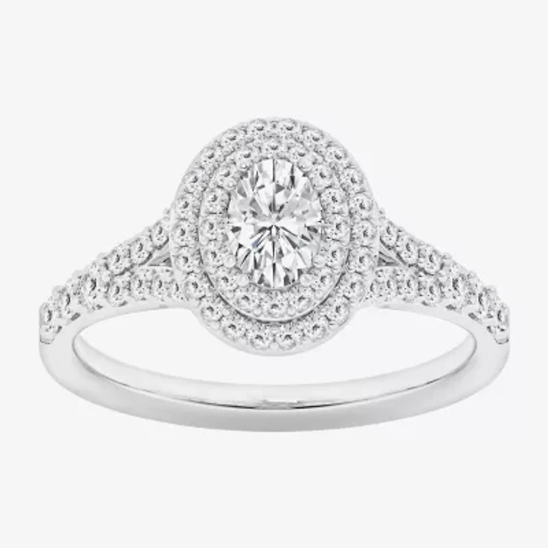 Make the moment you ask the love of your life to be forever yours extra special with this beautiful halo engagement ring. The 61 Lab Grown diamonds are set in polished 10K white gold with an oval center piece that highlight its design.