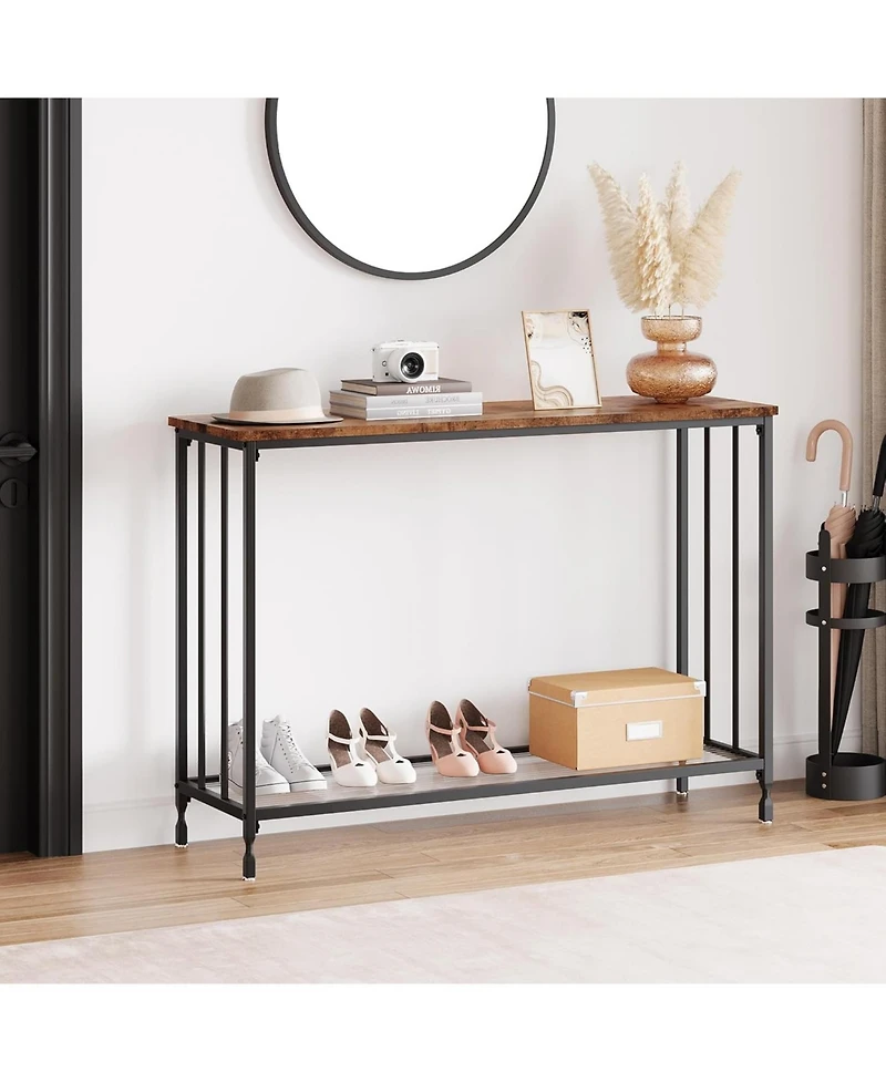 This 2-tier industrial console table features multiple shelves, a retro finish, and a narrow design—perfect for adding storage to entryways, foyers, bedrooms, or living rooms.