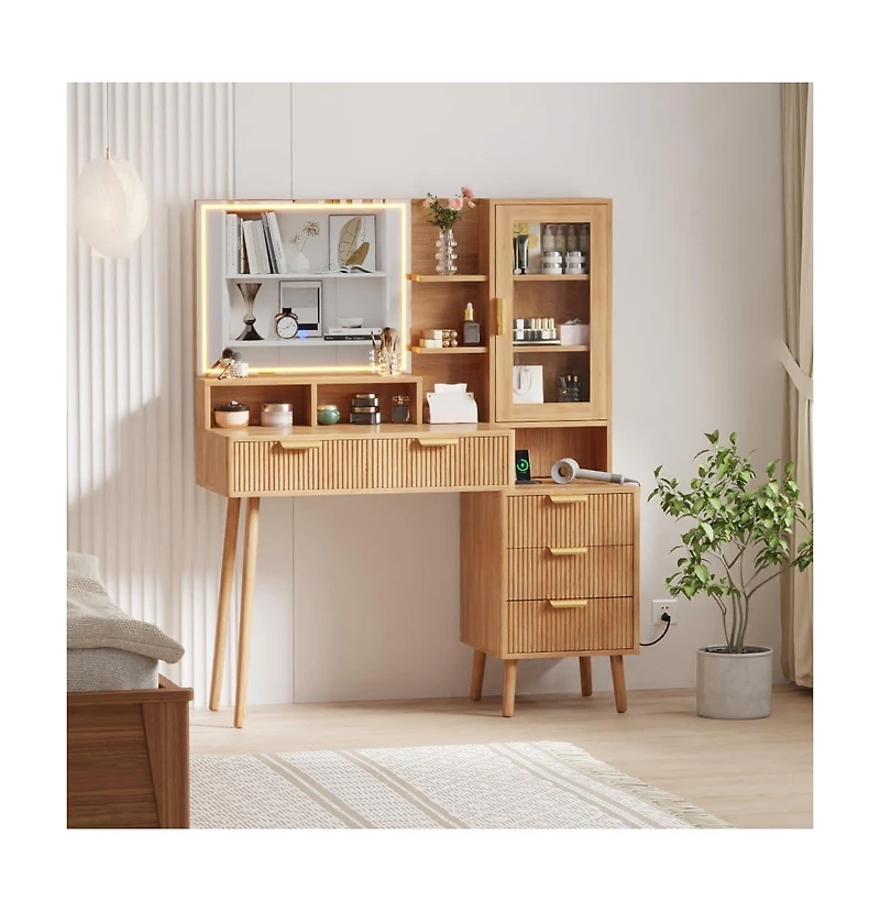 5 Drawer Makeup Vanity Desk Lights and Power Outlet, Modern Fluted Design, 23.6" Hd Lighted Mirror, Solid Wood Legs, Ample Storage Shelf for Women and Girls - Perfect for Bedroom or Dressing Room for Bedrooms, Apartments, Easy to Assemble