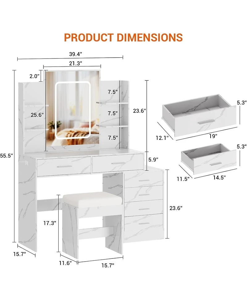 gaomon 6-Drawer Marble White Makeup Vanity Set, Mirror with Led Lights, Usb Charging, Vanity Stool, Bedroom, Dressing Room in Franklin, TN