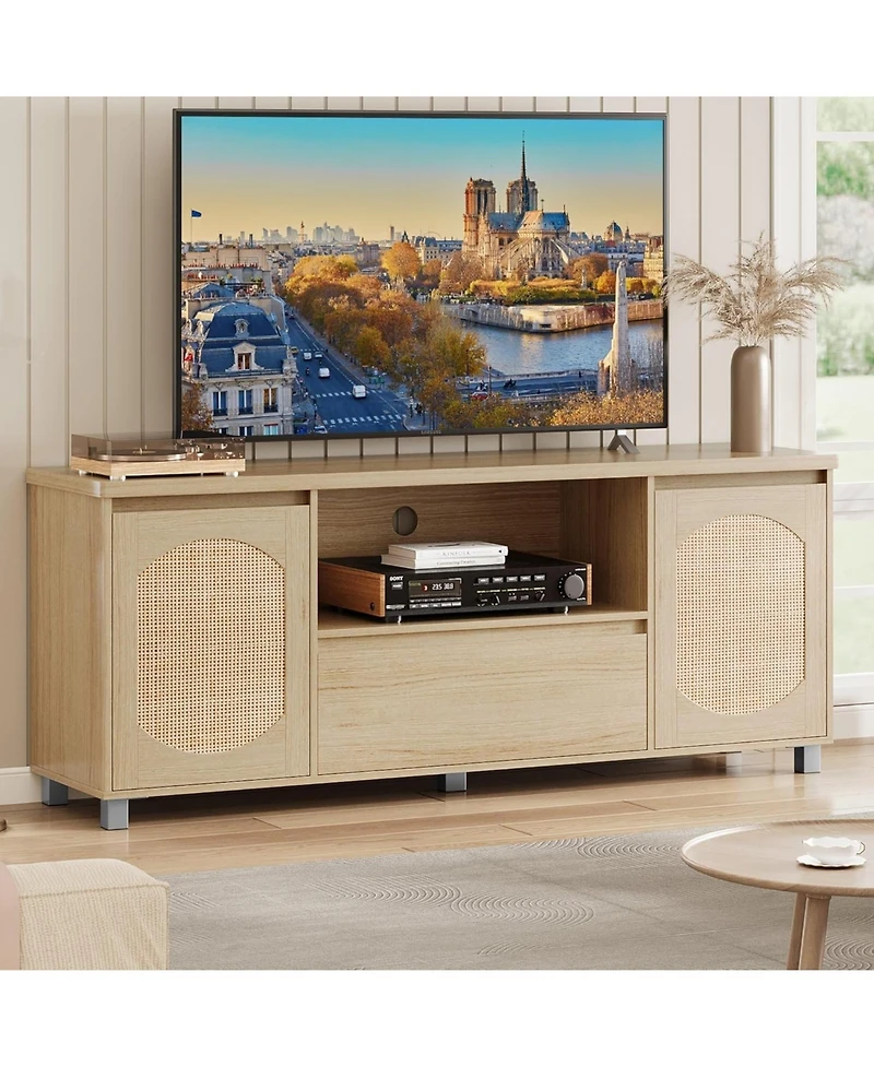 Gaomon 63" Rattan Tv Stand for TVs up to 70", Modern Entertainment Center with Storage Drawer & Open Shelves Media Cabinet