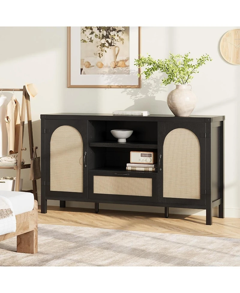 59"" Buffet Cabinet with Storage, Rattan Sideboard with Doors and Drawers, Farmhouse Kitchen Storage Cabinet with Adjustable Shelves, Boho Wooden Coffee Bar Cabinets for Kitchen, Living Room