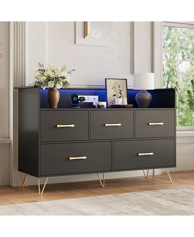 Led Dresser with Charging Station - Modern 5-Drawer 47" Wide Wooden Chest, Storage Organizer for Bedroom, Nursery, Hallway and Apartments
