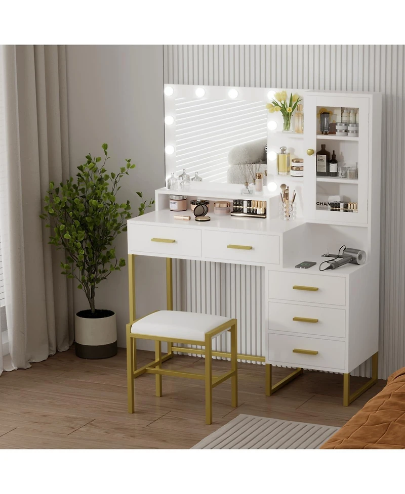 gaomon Makeup Vanity with Upholstered Stool & Charging Station, Vanity Desk with Mirror and Lights
