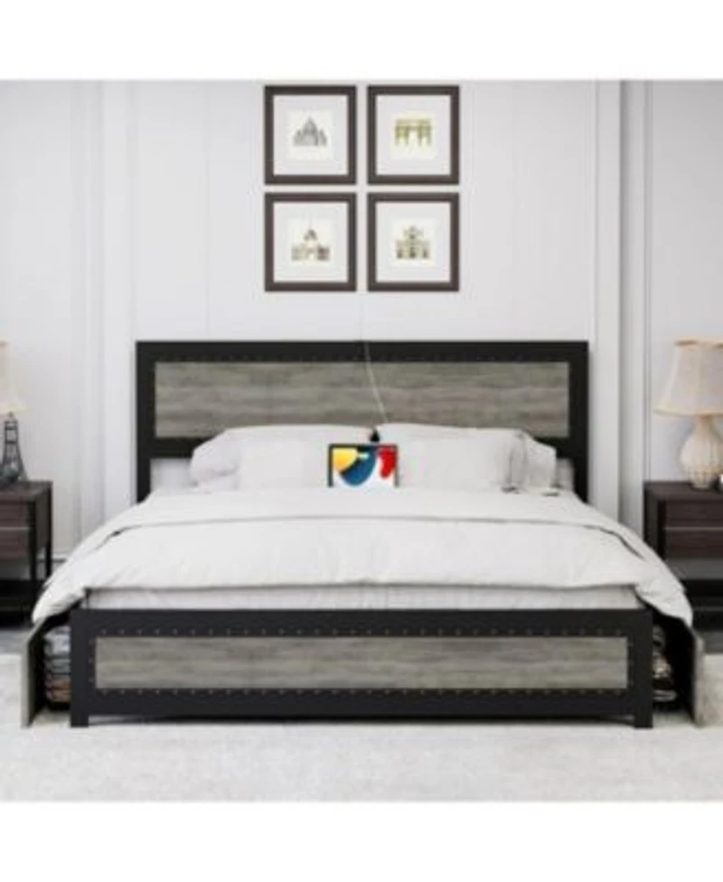 Bed Frame with Headboard:This industrial bed frame seamlessly combines vintage high-quality boards with a robust black metal structure, showcasing a warm industrial and rustic aesthetic that integrates beautifully with your home decor. The stylish design features a headboard adorned with decorative rivetsAmple Storage Space:Equipped with 4 removable storage drawers and 2 large side drawers on each side, this bed frame provides ample storage for bed linens, accessories, and seasonal clothing. It effectively maximizes space while keeping your room neat and organizedBed Frame with Charging Station: Equipped with one Usb port and one Type-c port, the bed frame combines retro design with modern technology to simplify the charging of everyday electronic devicesSturdy and Stable:Constructed with a strong metal support system, this high-quality bed frame ensures exceptional strength and durability. Utilizing10 metal poles instead of wooden boards significantly enhance