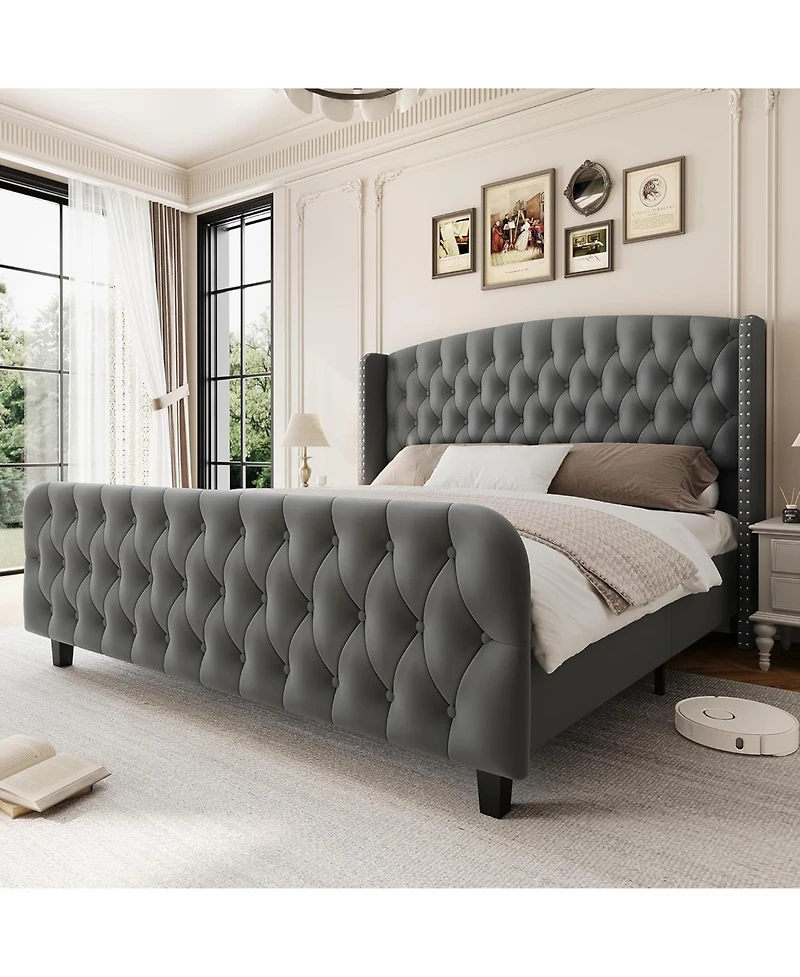 Velvet FabricElegant and Tall Wingback HeadboardWith its 51"" tall wingback headboard, deep button tufting, and delicate double nailhead trim, this bed frame adds a soft, welcoming charm to your room. The velvet finish makes it the perfect cozy upgrade for your bedroom retreat.Velvet Comfort and Quiet Nights Wrapped in plush velvet fabric and featuring an Eva sponge for noise reduction, this frame with headboard ensures a peaceful, luxurious sleep. Imagine sinking into velvety softness every night without a creak or squeak to disturb your dreams.Stable and Sturdy StructureFeaturing a sturdy steel frame and 12 evenly spaced solid wood slats, it provides reliable support for your mattress. The center metal legs help prevent sagging and extend your mattress's lifespan. With a heavy-duty design that holds up to 1000 pounds, you can sleep easy knowing it's built for strength and durability.