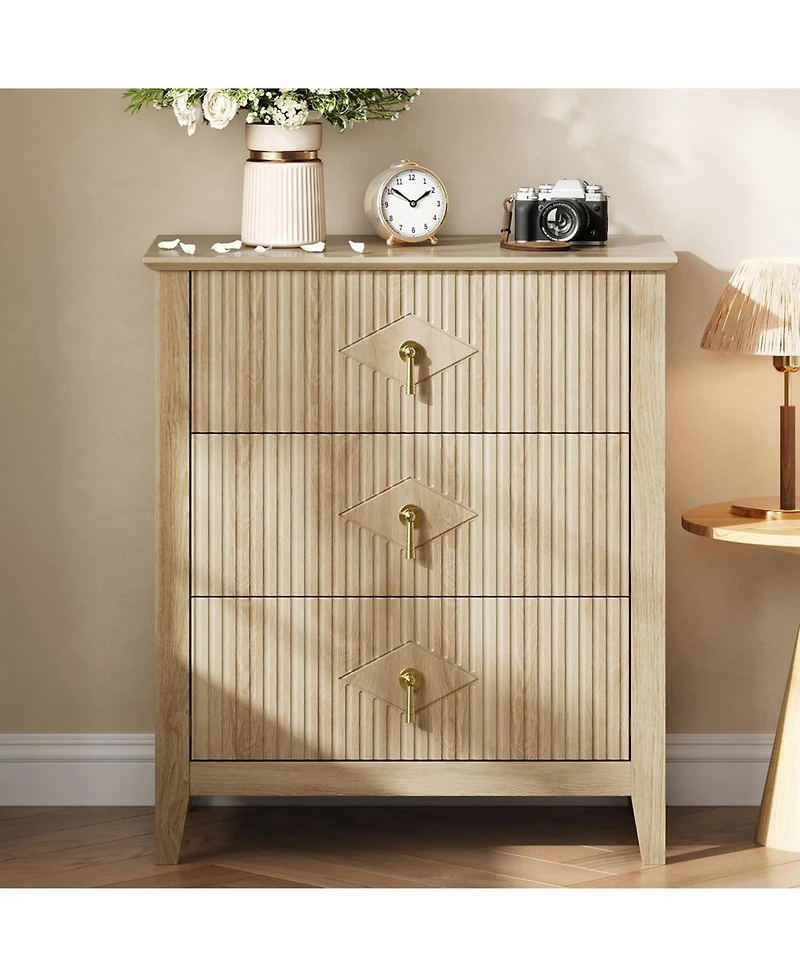 Wood Nightstand Fluted Dresser for Bedroom, 27.5" Wide 3-Drawer Bedside Tables, Modern Chest of Drawers, Storage End Table Living Room, Hallway, Entryway, Oak