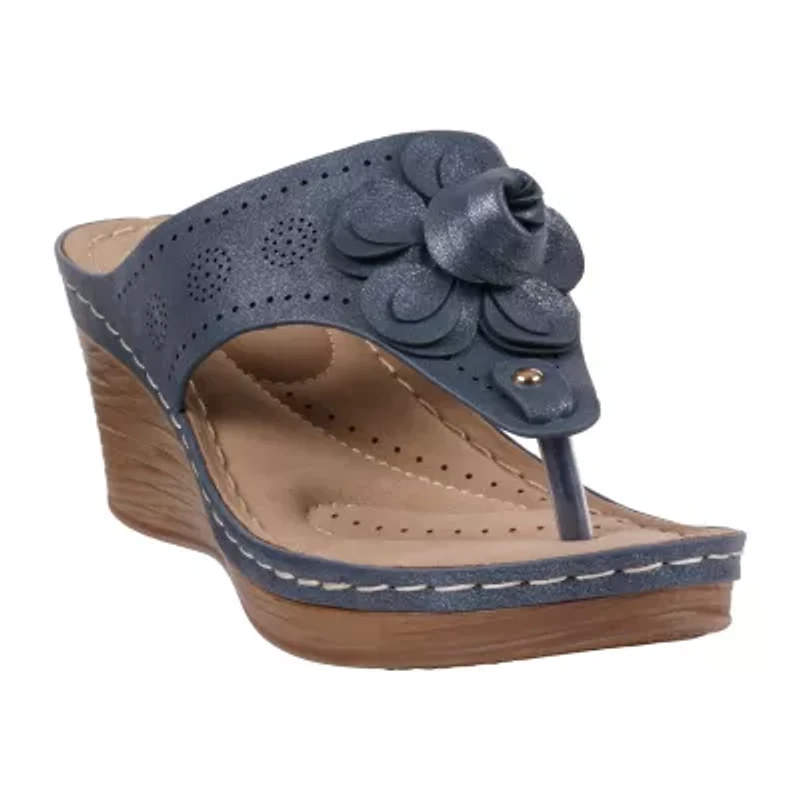 The GC Shoes Willa Floral Wedge Thong Sandal brings soft elegance to your warm-weather wardrobe. Designed with a smooth faux leather upper, this style features a dimensional floral accent that adds a charming, eye-catching touch. The cushioned footbed and supportive wedge heel provide comfort and stability for all-day wear. Finished with subtle perforated details, Willa pairs beautifully with sundresses, skirts, or casual denim for an effortlessly polished look.