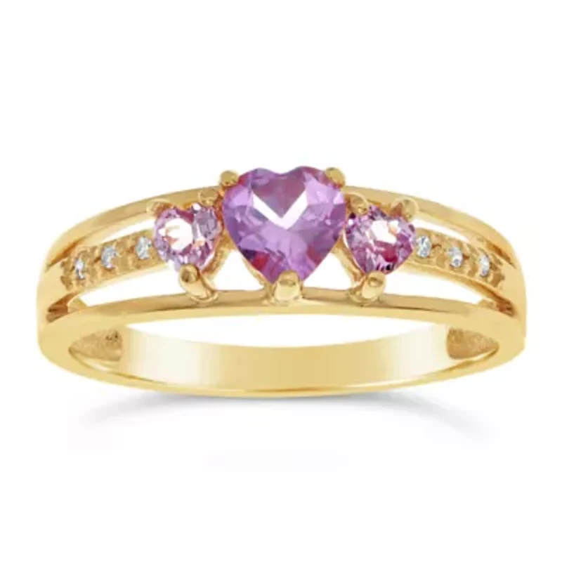 This beautifully crafted ring showcases a 5mm heart-shaped center stone that draws the eye with its vibrant color and romantic silhouette, perfectly complemented by two 3mm heart-shaped side stones for added depth and symmetry. A delicate 0.018 cttw diamond accent sparkles along the shoulders, adding a refined touch of brilliance. Designed to balance elegance and everyday wearability, this ring offers a timeless yet charming look that makes a meaningful statement on its own or stacked with favorites. 9 Color rating: H, I Clarity rating: I2I3 Polished finish Prong setting Peru Imported Product Specifications 6mm 0.64 Material & Care Metal, Gold plated Use silver polishing cloth on silver items.