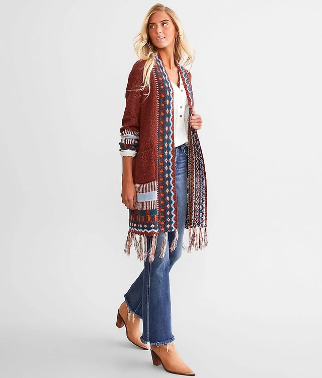 Geo Print Fringe Cardigan Sweater