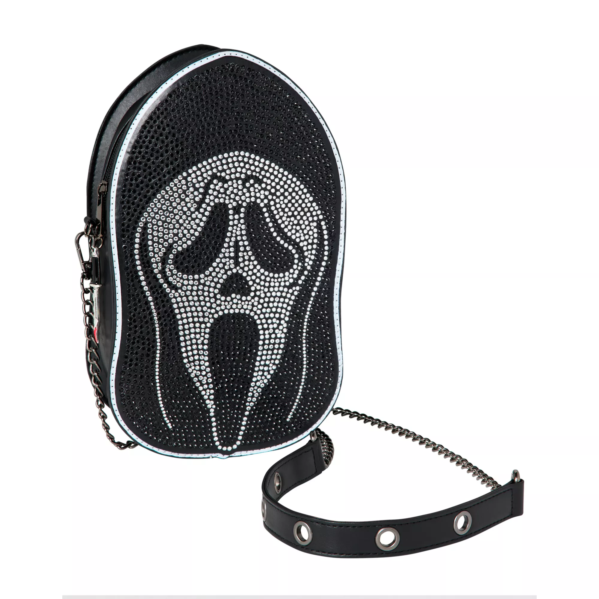 Carry your horror fandom wherever you go with this officially licensed Ghost Face Bling Crossbody Bag! This bedazzled bag is shaped like Ghost Face's iconic mask and lets you easily carry all your essential gear on Halloween or any time.