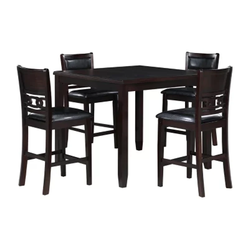 Complete your dining space with the new classic furniture gia 5-piece square wood counter dining set, a harmonious blend of durability and beauty. Crafted from solid rubberwood and Mindi veneers, this set is designed to withstand the test of time. The deep ebony finish, achieved through a meticulous multistep process, enhances the natural grain of the wood. The spacious 42-inch square counter table comfortably accommodates four, making it an ideal setting for intimate gatherings. The chairs, with black pu upholstered cushions, are supported by solid wood legs reinforced with four base stretchers, doubling as footrests for added stability. The distinctive design includes a fancy face reverse diamond veneer dining tabletop, interlocking chain chair back detail, and tapered legs. Assembly is easy with all necessary hardware and clear instructions included. Backed by a one-year warranty, this gia 5-piece dining set offers both practicality and style for your dining area. Invest in quality and enjoy timeless design with this functional dining set.