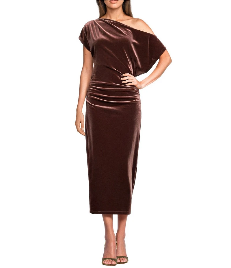 Gibson & Latimer Velvet Asymmetric Neck One Shoulder Off-The-Shoulder Short Sleeve Ruched Sheath Midi Dress