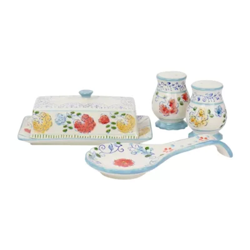 The Gibson elite Anaya 5-piece hand painted stoneware table accessory set is just the thing a home needs to welcome in any guest. Each piece features whimsical floral designs with country cottage like patterns. The stoneware construction is durable enough to handle any situation at the dinner table. Season up plates with the matching shakers. Place serving spoons on the spoon rest in style and offer butter for freshly baked bread with the charming butter dish!