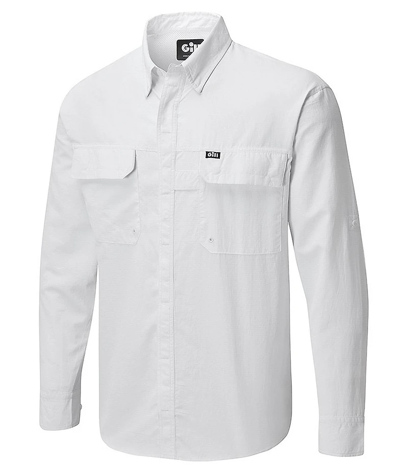 From Gill, this shirt features: point collar long sleeves solid concealed placket with press stud fastening dual chest patch pockets self-fabric string to hang sunglasses micro-fiber panel can clean glasses breathable and lightweight XPEL stain-resistant technology nylon/polyester machine wash; tumble dry Imported.