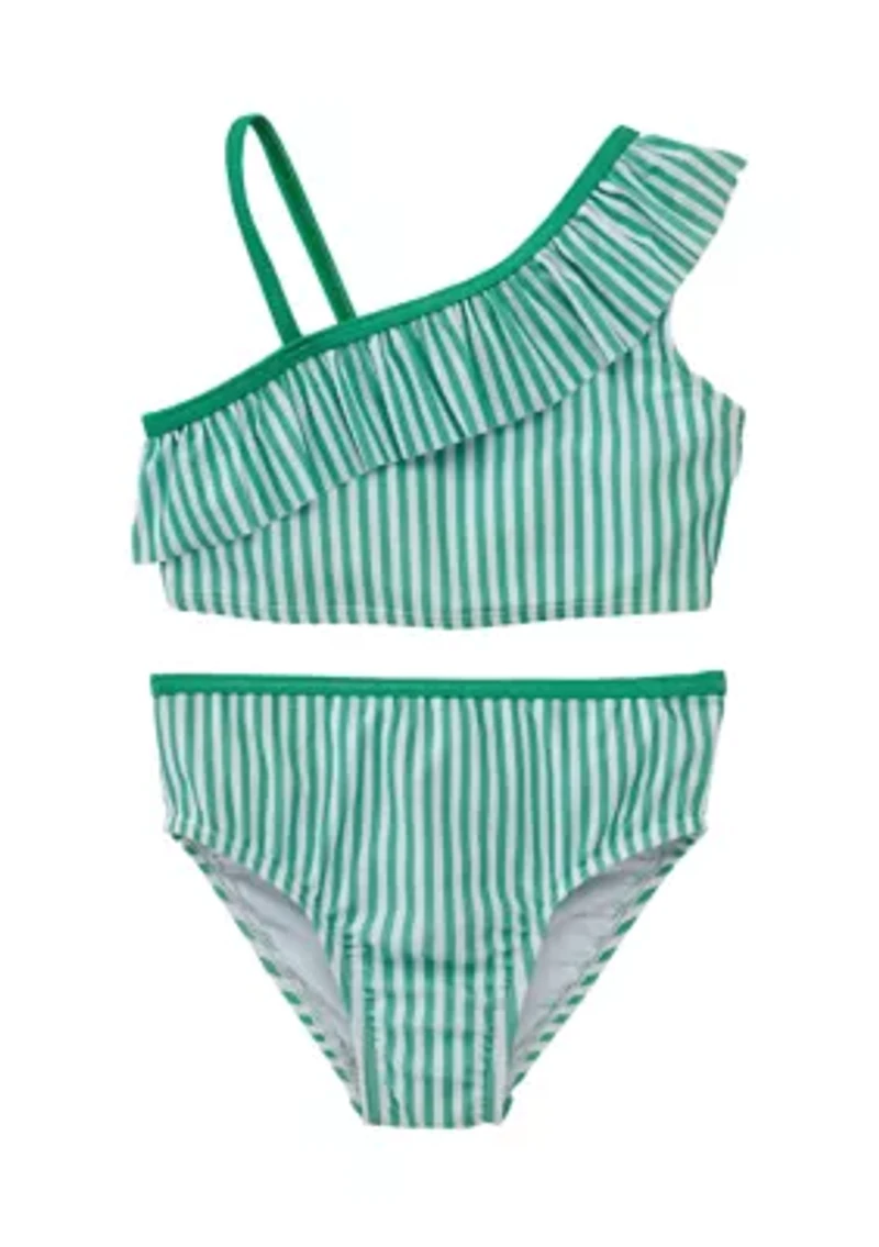 Whether she's building sandcastles on the shore or splashing in the sea, she will look adorable in this striped swimsuit from Crown & Ivy™. 2-piece set Top: pullover, asymmetrical neck, sleeveless Bottoms: elastic waistband Imported Belk Exclusive Material & Care Polyester, spandex Machine washable