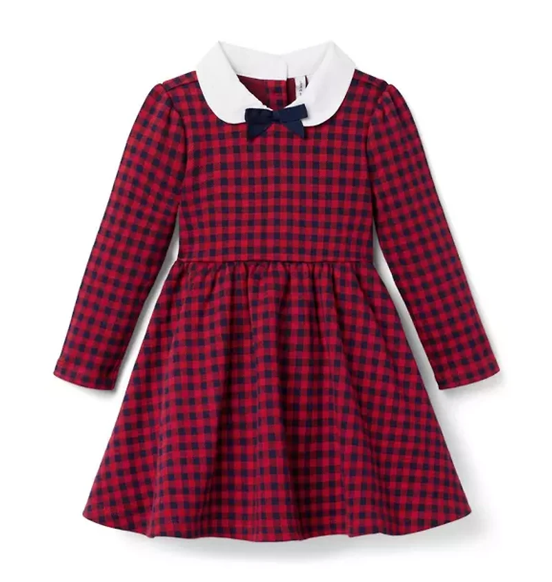 Holiday-ready details? This gingham dress checks every box. Designed in soft jacquard with a contrast collar and a bow, of course. 100% Cotton Jacquard Long Sleeve Button Back Bloomer Included (Sizes Up To 18-24M) Matching Family Styles Available Machine Washable; Imported