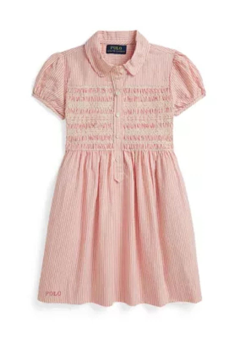 This Ralph Lauren Childrenswear dress features a classic collared neckline with short puff sleeves for a sweet, polished look. Crafted from breathable mesh fabric with timeless stripes, it’s perfect for playdates, school days or special outings. Collared neck Puff sleeves Striped pattern Imported Material & Care 100% cotton Machine washable