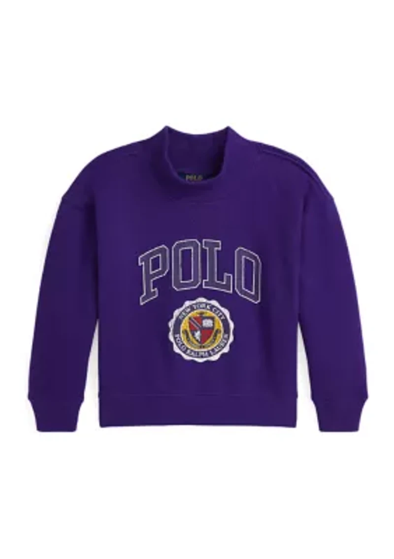 This sweatshirt combines Ralph Lauren Childrenswear's ultrasoft and lightweight peached fleece with a weathered collegiate-inspired graphic. Size 4-4T has a 15.5" body length (front and back) and a 20.5" sleeve length Sleeve length is taken from the center back of the neck Ribbed mock neck Ribbed V-inset Long dropped-shoulder sleeves with ribbed cuffs “Polo” and a “Polo Ralph Lauren” crest crackle-printed at the center front Ribbed hem Imported Material & Care Cotton, polyester Machine washable
