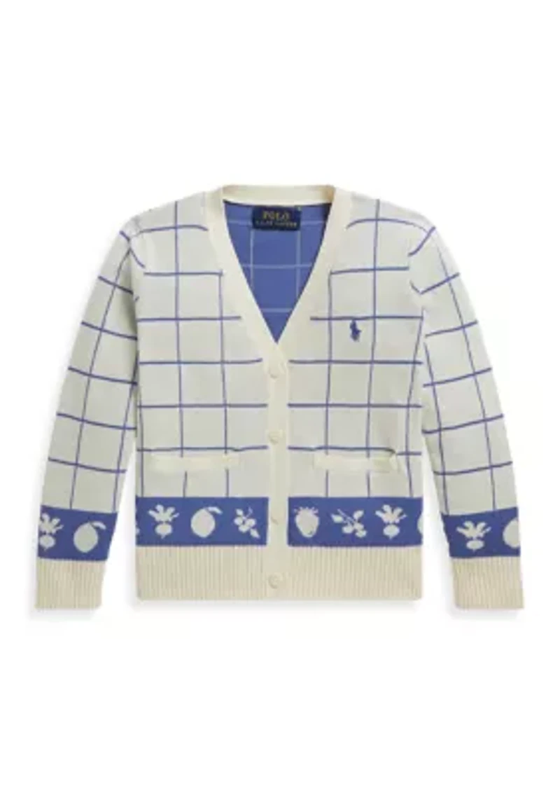 Inspired by New England’s effortless coastal charm, this cardigan unites a windowpane pattern with a motif of fruits and vegetables at the hem. It is made with lightweight combed cotton then washed for added softness. 100% cotton. Machine washable. Size 4 has a 14.5" body length (front and back) and a 14.25" sleeve length. Signature embroidered Pony at the left chest. V-neck. Buttoned placket. Long sleeves with rib-knit cuffs. Two front waist welt pockets. Rib-knit hem. Imported. Imported