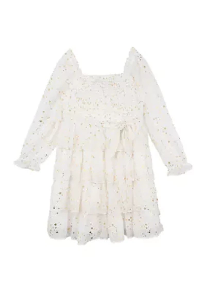 Shiny foil stars glow brightly along the flowy silhouette of this lovely long-sleeve dress from Rare Editions. The easy pullover design makes it a charming choice for her next occasion. Pullover Square neck Long blouson sleeves with cuffs Imported Material & Care Polyester Machine washable