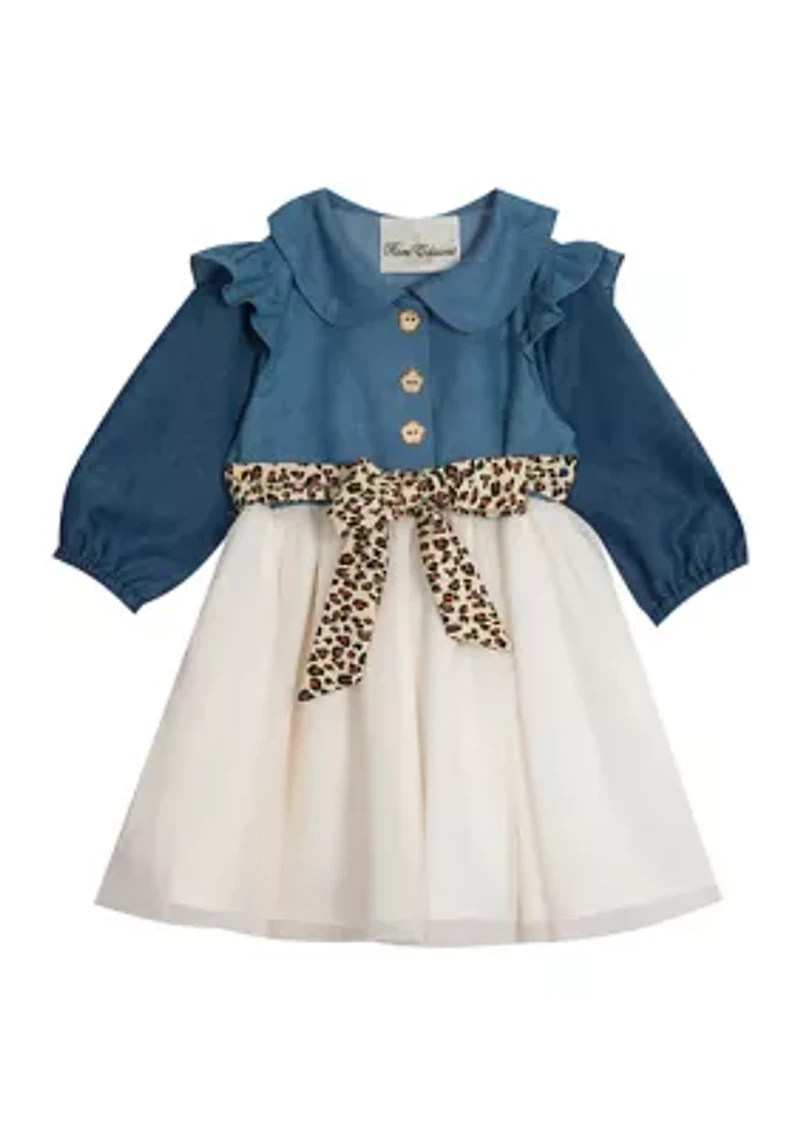 Your little girl will look absolutely wonderful in this super cute dress from Rare Editions. Featuring a button-front denim bodice and a delicate pleated skirt, this dress is finished with a stylish animal-printed belt along the waist. Button closure Collar Long puff sleeves with flutter shoulders Imported Product Specifications Knee length Material & Care Cotton, polyester Machine washable