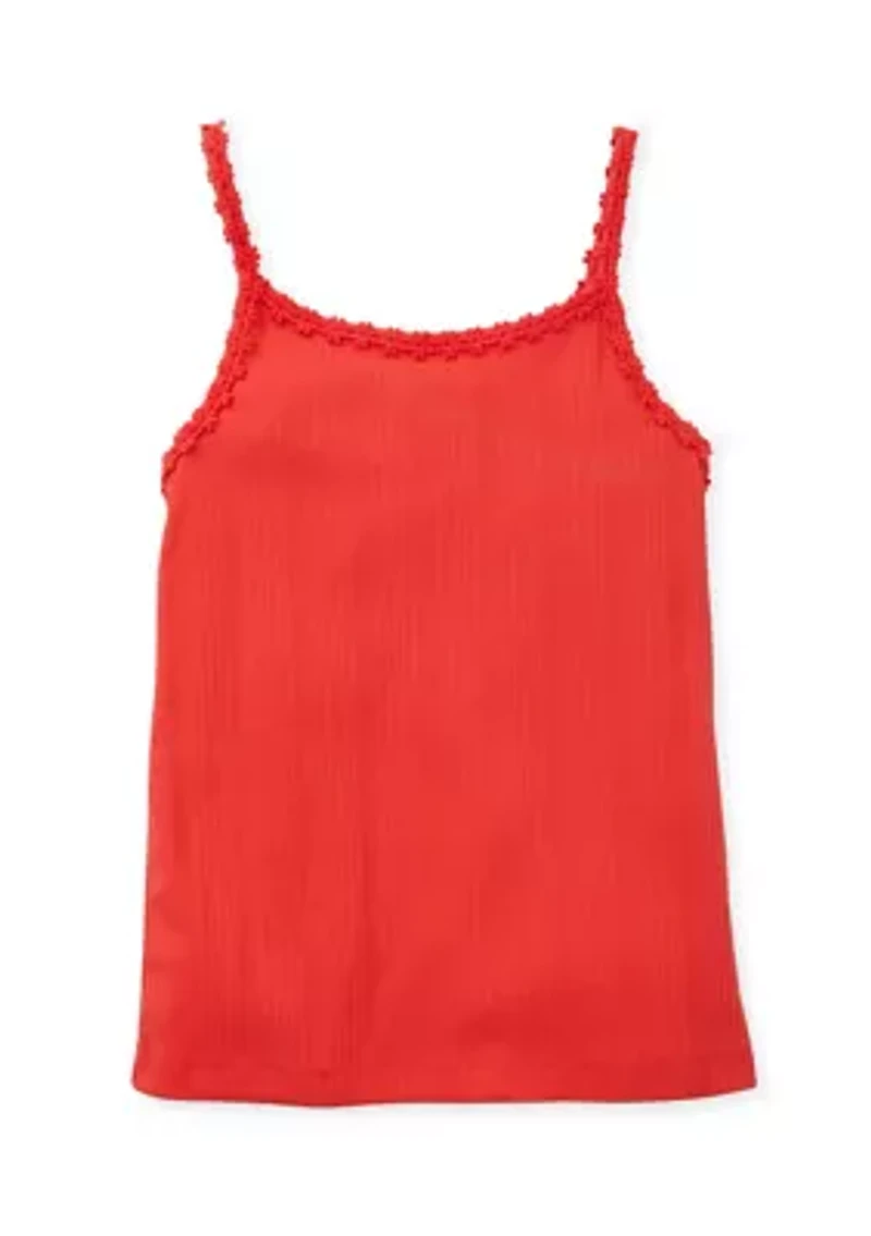 This sleeveless tank is a must-have for your little girl's summer wardrobe. Made from a soft and breathable blend, it will keep her comfortable all day long. The scoop neckline and pullover closure make it easy to get on and off, while the daisy trim adds a touch of sweetness. Perfect for any occasion, this tank can be dressed up or down. Pullover Scoop neck Sleeveless Imported Belk Exclusive Material & Care Cotton, polyester Machine washable