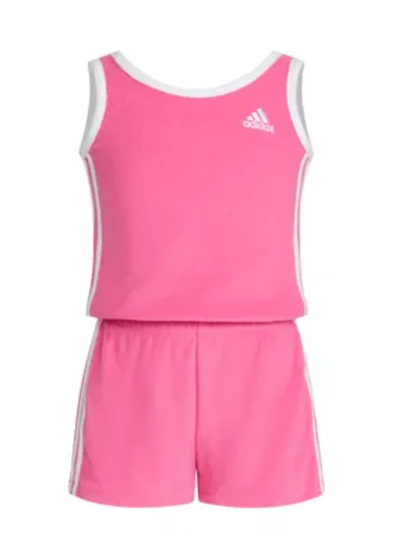 A cute way to show off her style, this soft cotton-blend romper from adidas is a sporty addition to her playtime assortment. Pullover Scoop neck Sleeveless Imported Material & Care Cotton, polyester Machine washable