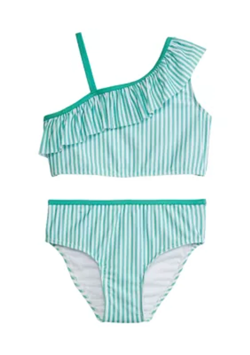 Decked out in green stripes, this 2-piece swimsuit from Crown & Ivy™ will quickly become her new favorite. 2-piece set Top: pullover, asymmetrical neck, sleeveless Bottoms: elastic waistband Imported Belk Exclusive Material & Care Cotton, polyester Machine washable
