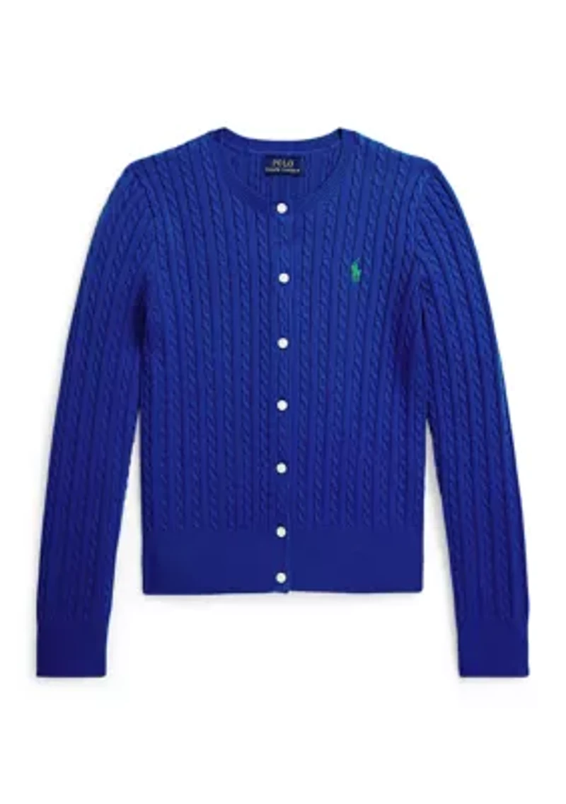 As iconic as when it was introduced decades ago, Ralph Lauren Childrenswear cable-knit cardigan adds signature Polo style to everything from dresses to jeans and a T-shirt. Buttoned placket Long sleeves with rib-knit cuffs Crew neck Signature embroidered Pony at the left chest Grosgrain trim along the under placket Imported Product Specifications Size medium has an 18.5" body length (front and back) and a 20" sleeve length Material & Care 100% cotton Machine washable