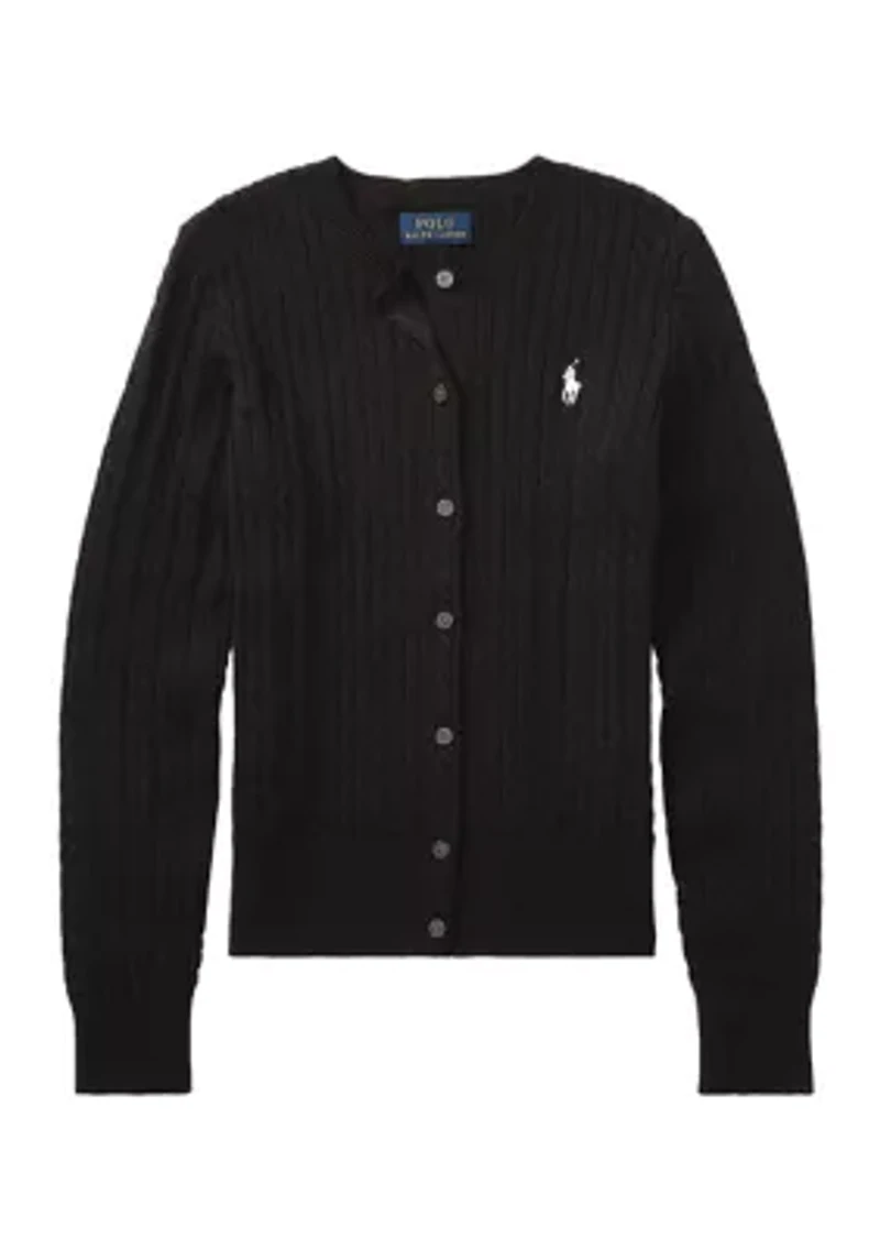 Made with soft combed cotton, this cable-knit cardigan from Ralph Lauren Childrenswear is the perfect medium-weight layer over tees and dresses. Buttoned placket Rib-knit crew neck Puffed long sleeves with rib-knit cuffs Rib-knit hem Grosgrain trim along the underplacket Signature embroidered Pony at the left chest Imported Product Specifications Size medium has an 18.5 in body length (front and back) and a 20 in sleeve length Signature embroidered Pony at the left chest Material & Care Cotton Machine washable