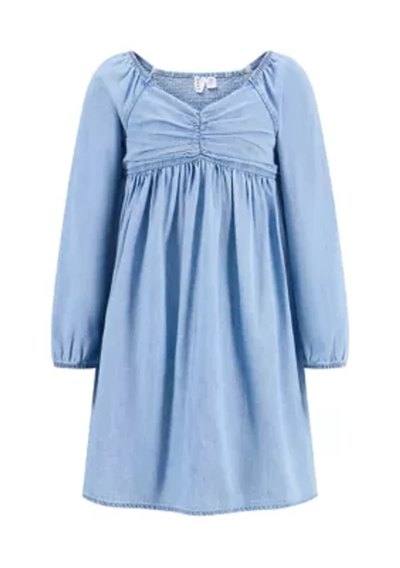 She'll love this adorable denim dress from Roxy! Crafted from lightweight cotton denim, it features a flattering fit-and-flare silhouette with front cinching and a comfortable smocked back bodice. The long sleeves with elastic cuffs and a scoop neck provide a stylish and comfortable fit. Easy to wear with its pullover closure, this dress is finished with a charming metal logo charm. Pullover Scoop neck Imported Material & Care Denim Machine washable