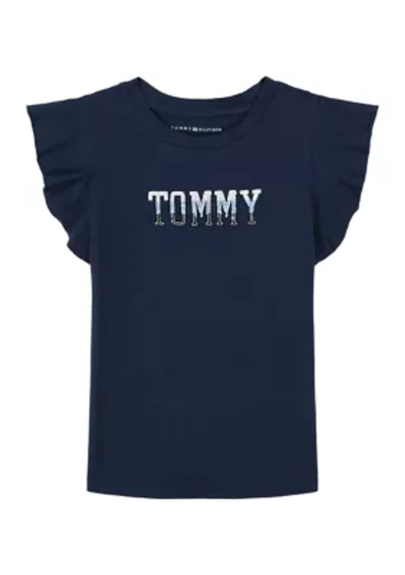 Light up her style with this super soft and extra cute sequined graphic t-shirt from Tommy Hilfiger. Button closure Crew neck Short flutter sleeves Imported Material & Care Cotton Machine washable
