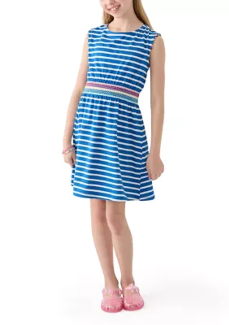 Twirl-worthy and totally comfy! This dress from Crown & Ivy™ has soft, stretchy knit fabric with cute yarn-dyed stripes and a smocked waist that moves with her. It’s perfect for everyday adventures, special outings or just spinning in circles for fun. Pullover Crew neck Sleeveless Imported Belk Exclusive Material & Care Cotton, polyester Machine washable