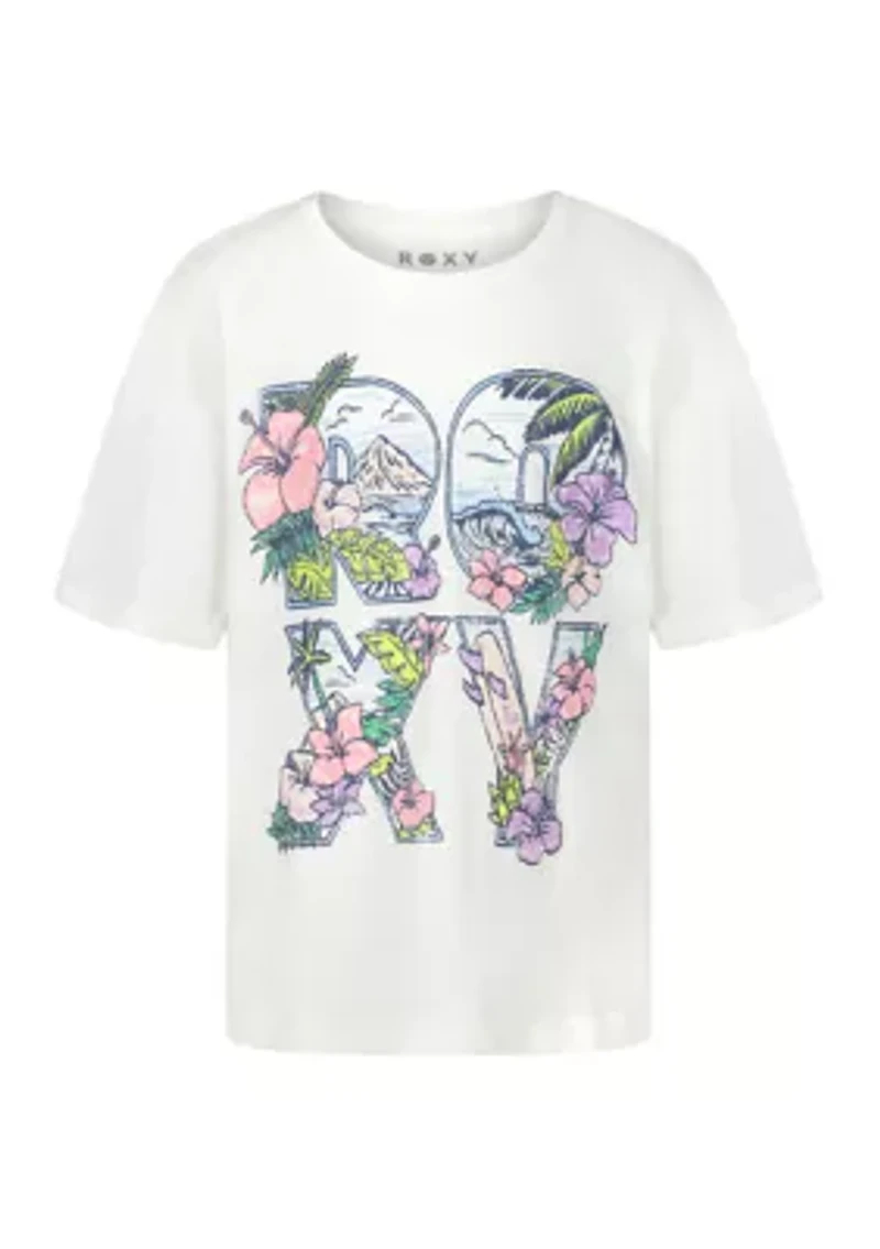 In oversized comfort, this Roxy t-shirt features a colorful graphic print that adds a playful touch to your girl's style. Pullover Crew neck Short sleeves Oversized fit Imported Material & Care 100% cotton Machine washable