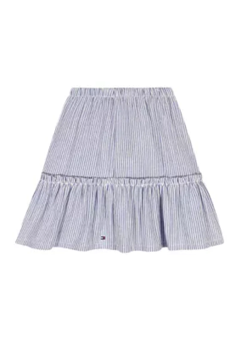 This adorable skirt from Tommy Hilfiger offers a comfortable fit with its elastic waistband. The tiered design adds a touch of playful style, making it a versatile addition to any wardrobe. Elastic waistband Imported Material & Care Cotton, polyester Machine washable