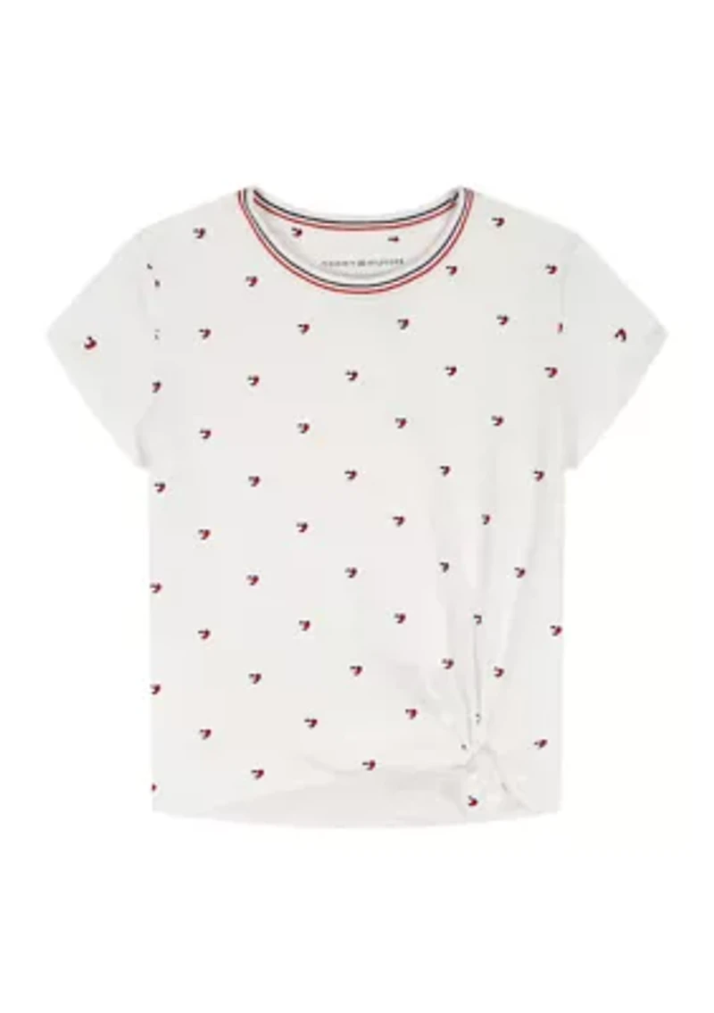 This comfortable t-shirt from Tommy Hilfiger is perfect for active girls. Designed with a classic crew neck and short sleeves, it features a fun allover print and a stylish striped neckline. Pullover Crew neck Short sleeves Imported Material & Care Cotton, polyester Machine washable