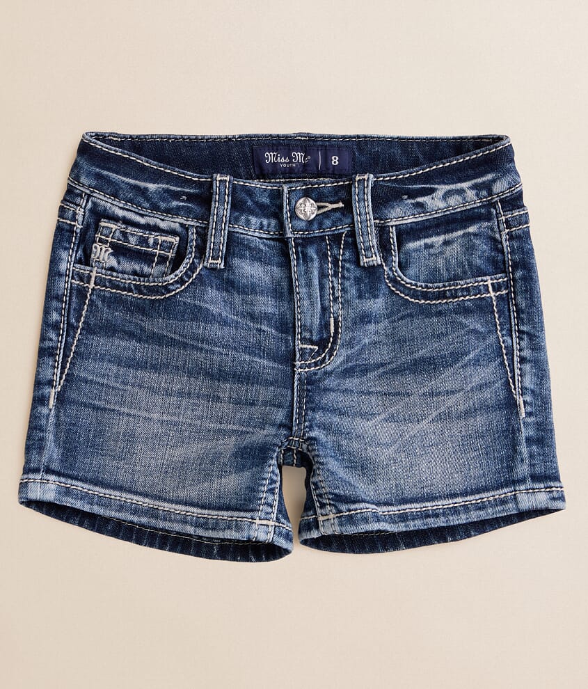 Mid-rise zip fly 2 1/2" stretch short Slim through the hip and thigh Adjustable waistband Sequins on metallic embroidered back pockets Regular button closure in sizes 7-16 Fraying details