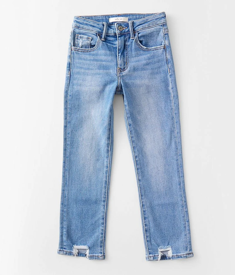 High rise zip fly stretch jean Inseam measures 27" on size 10 and will grade accordingly to size 13" bottom opening Slightly fitted through the hip and thigh Adjustable waistband Snap button closure in sizes 5-8 Regular button closure in sizes 10-16 Destruction details