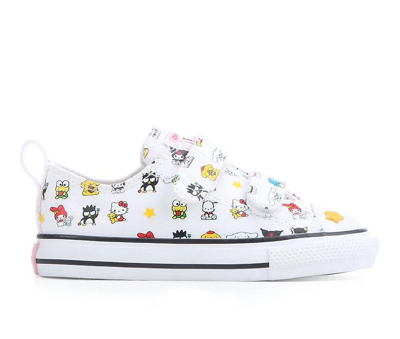 Girls' Converse Infant & Toddler Chuck Taylor 2V Ox Hello Sneakers The Converse Chuck Taylor All Star 2V Ox Hello Kitty Print is a toddler casual sneaker built on the classic low-top Chuck silhouette with an easy-closure design. A durable canvas upper features an allover Hello Kitty and Friends print, while two hook-and-loop straps and a heel pull loop help streamline on/off. Underfoot, foam cushioning and a rubber midsole/outsole support everyday play.