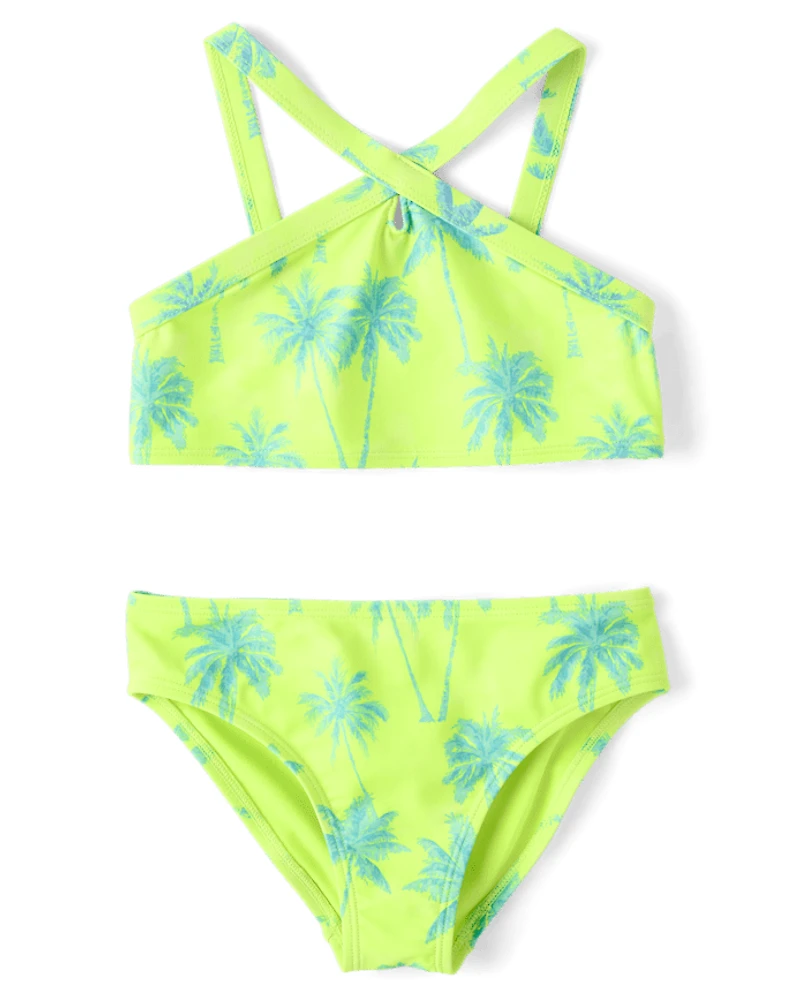 Girls Palm Tree Cross Front Bikini Swimsuit