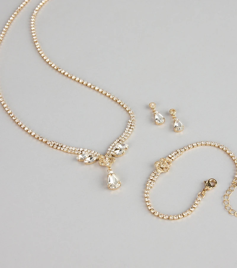 A little sparkle goes a long way—especially when it's wrapped in warm tones. This teardrop rhinestone jewelry set gives that polished, dressed-up glow with dainty flower details that make any outfit elevated.